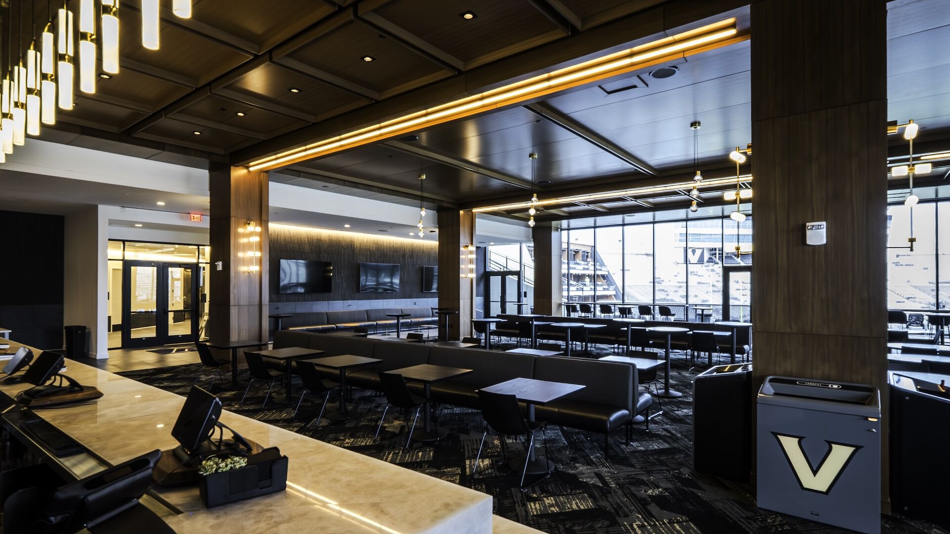 Vanderbilt University set out to transform FirstBank Stadium’s south end zone into a premier destination that elevates the game day experience for fans, players, and recruits. The goal: create premium spaces that reflect the Commodores’ SEC ambitions, generate new revenue, attract donors, and match the energy of Nashville’s entertainment scene.
